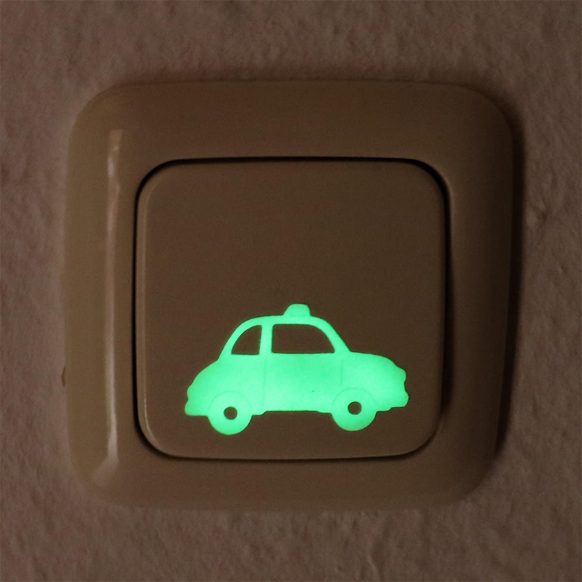 Der leuchtende Sticker in Form eines kleines Autos besteht aus einer selbstklebenden phosphorisierenden Folie. Während fluoreszierende Folie nur bei Tageslicht strahlt, speichert diese phosphorisierende Folie das Licht und gibt es bis zu 5 Stunden wieder ab. Der selbstleuchtende Sticker kann überall im Kinderzimmer angebracht werden und verbessert die Orientierung in der Nacht, z. B. wenn die Kleinen mal raus müssen.